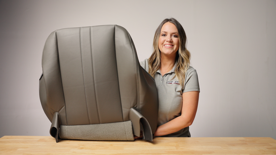 This replacement cover is manufactured using a vinyl seating surface and vinyl side skirting. Our research and development team has matched the color, grain, and fitment from your original cover. Each panel is digitally cut, and then sewn to OEM specifications to ensure a proper fit. This cover is NOT A SLIP ON, but will replace the existing cover. The Seat Shop is the AUTHORITY in factory match replacement leather seat covers! Are you tired of the old, worn out seats in your vehicle? We manufacture our brand new OEM style replacement seat covers in Dallas, Texas.