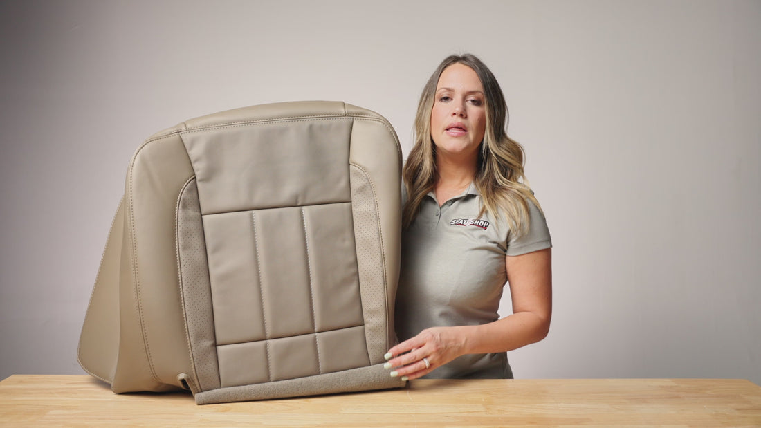 This replacement cover for your Dodge Ram Laramie is manufactured using a leather seating surface and vinyl side skirting. Our research and development team has matched the color, grain, and fitment from your original cover. Each panel is digitally cut, and then sewn to OEM specifications to ensure a proper fit. This cover is NOT A SLIP ON, but will replace the existing cover. The Seat Shop is the AUTHORITY in factory match replacement leather seat covers! Are you tired of the old, worn out seats in your vehicle? We manufacture our brand new OEM style replacement seat covers in Dallas, Texas.