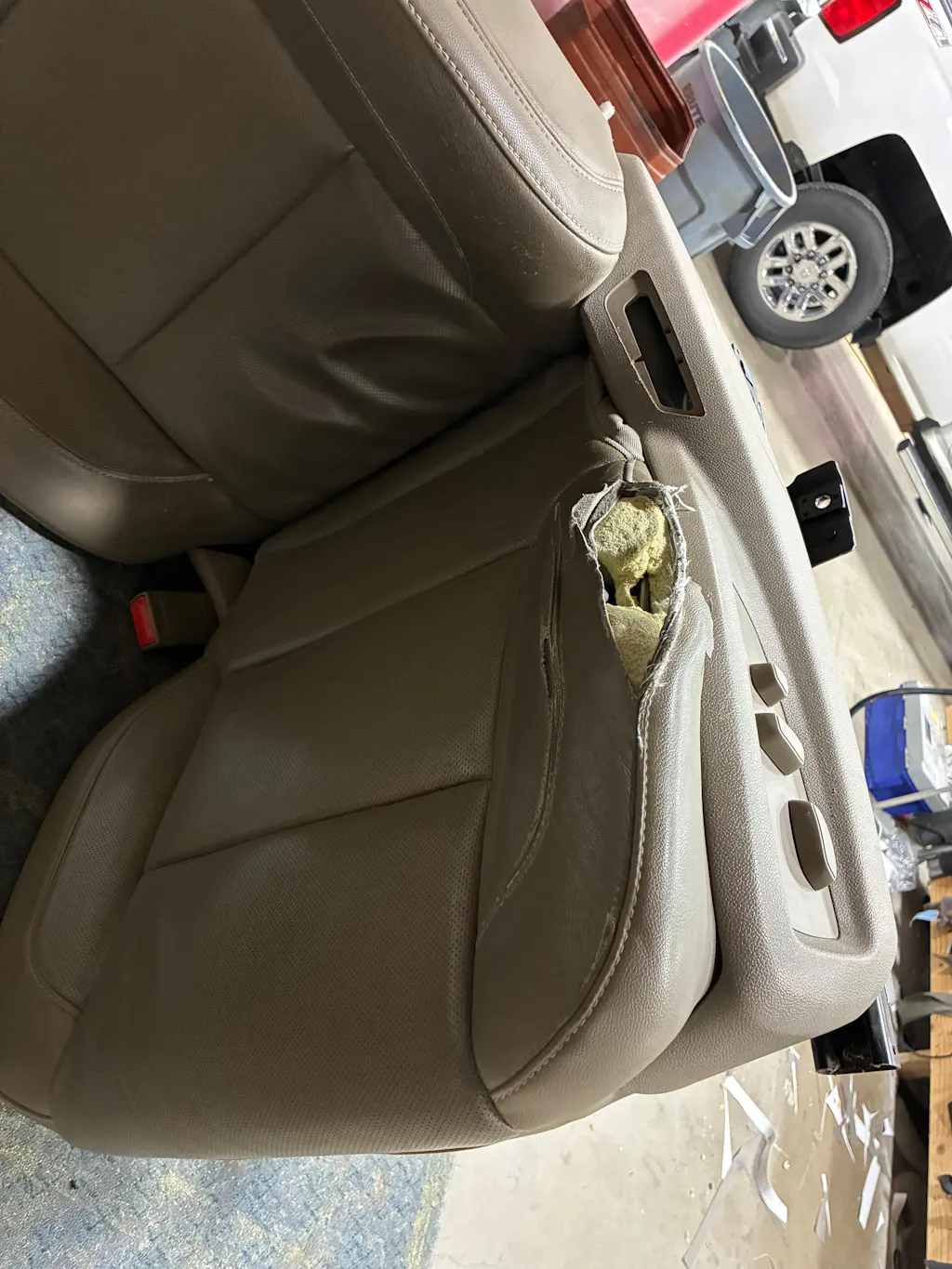 This replacement cover is manufactured using a leather seating surface and vinyl side skirting. Our research and development team has matched the color, grain, and fitment from your original cover. Each panel is digitally cut, and then sewn to OEM specifications to ensure a proper fit. This cover is NOT A SLIP ON, but will replace the existing cover. The Seat Shop is the AUTHORITY in factory match replacement leather seat covers! Are you tired of the old, worn out seats in your vehicle? We manufacture our brand new OEM style replacement seat covers in Dallas, Texas.
